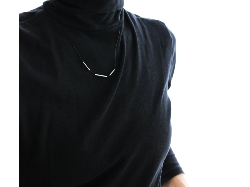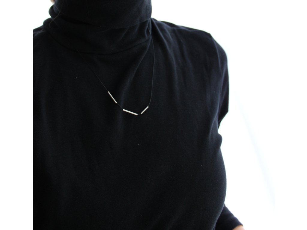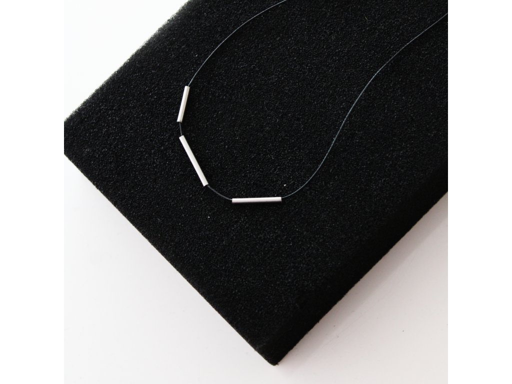 Tři kratší trubičky z nerezové oceli fixně navlečené na černém syntetickém lanku.