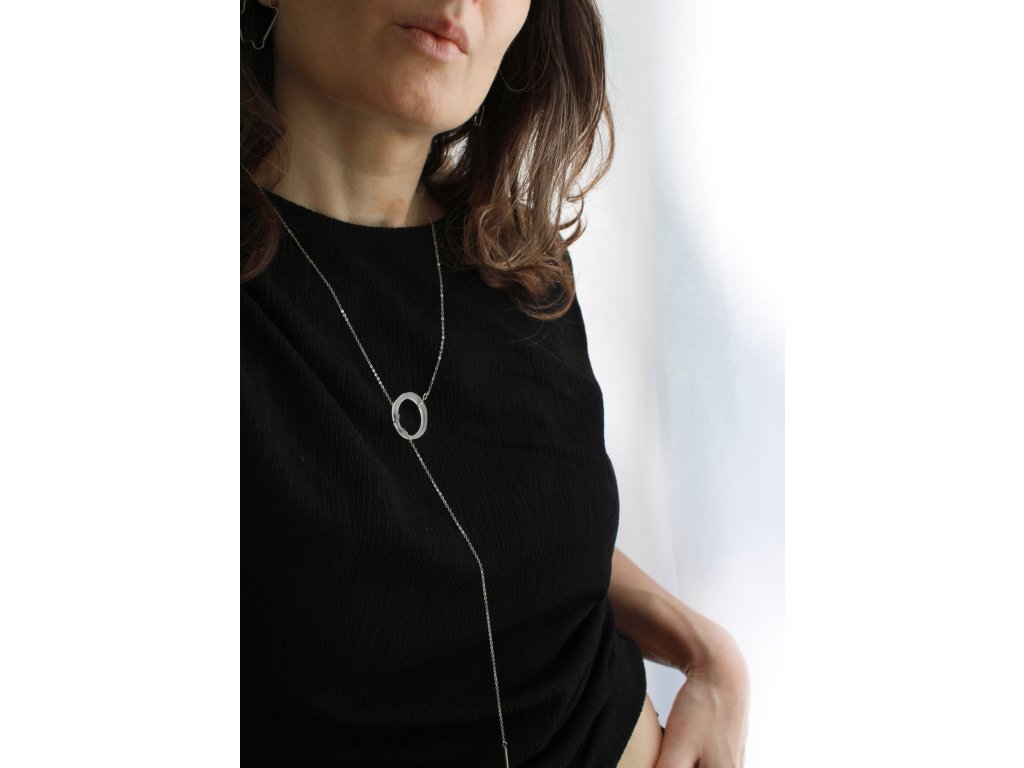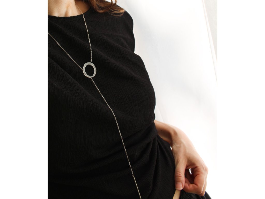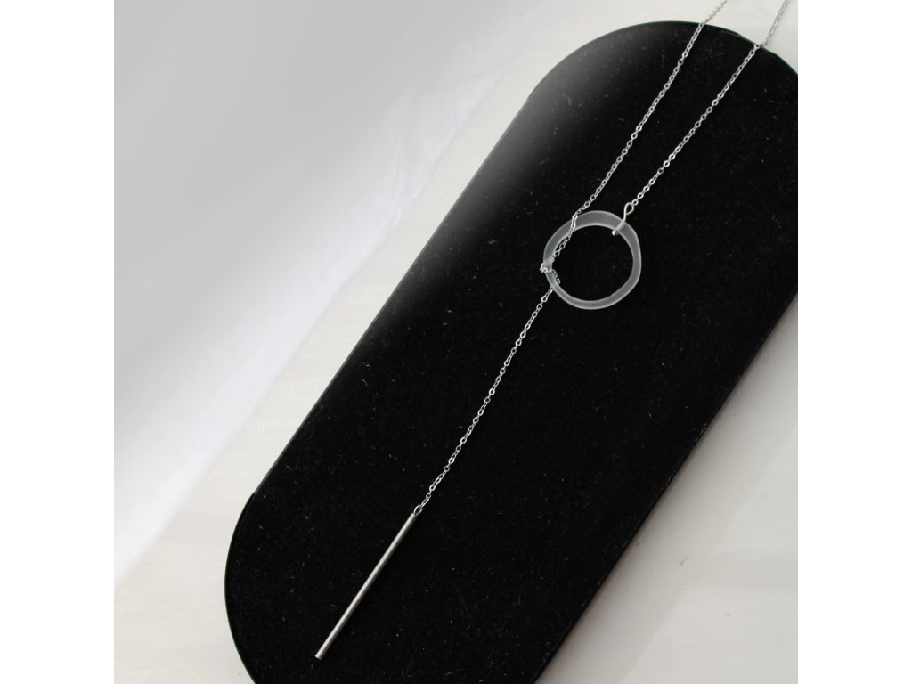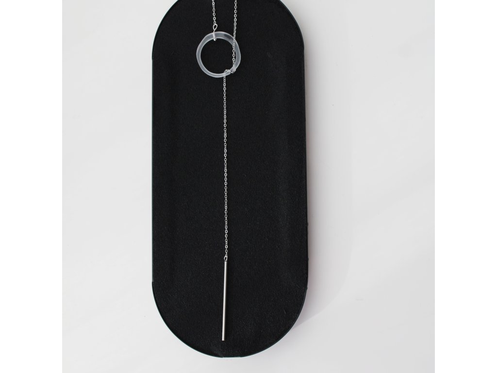 Elegantní náhrdelník, který funguje na principu protažení a obtočení nerezového řetízku skrze zvlněný kroužek z průsvitného akrylátového skla.