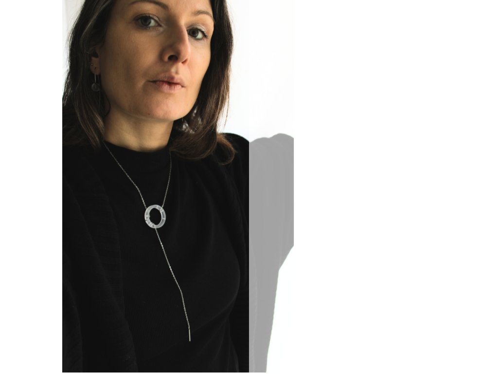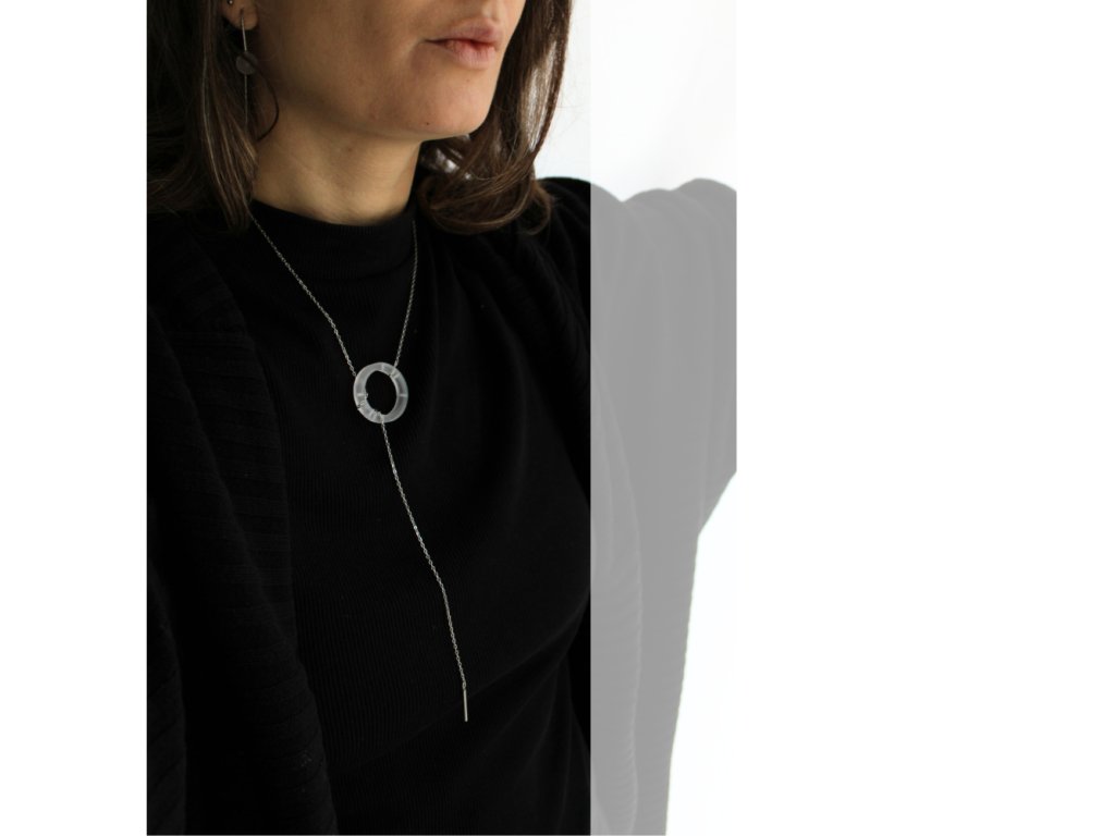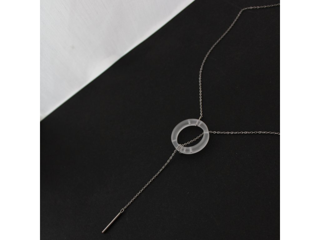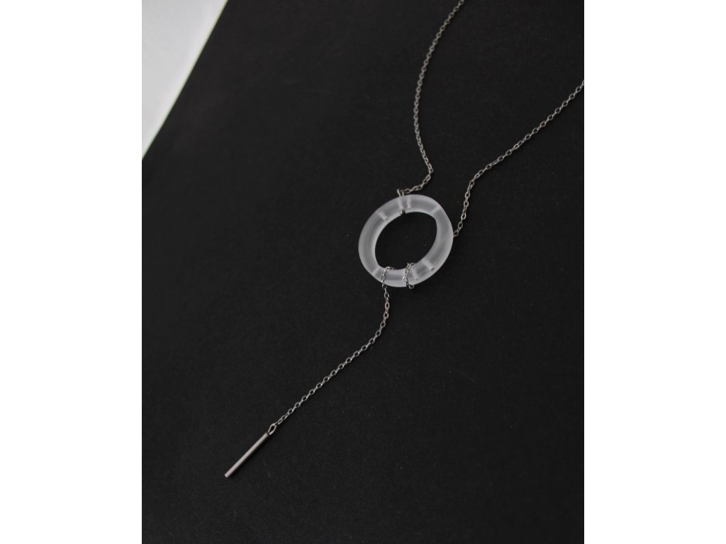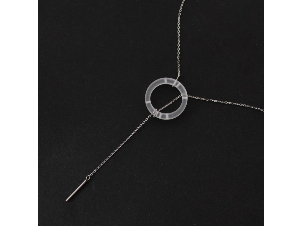 Náhrdelník, který funguje na principu protažení a obtočení nerezového řetízku skrze zvlněný kroužek z akrylátového skla.