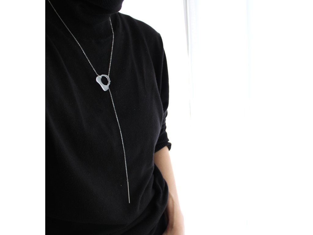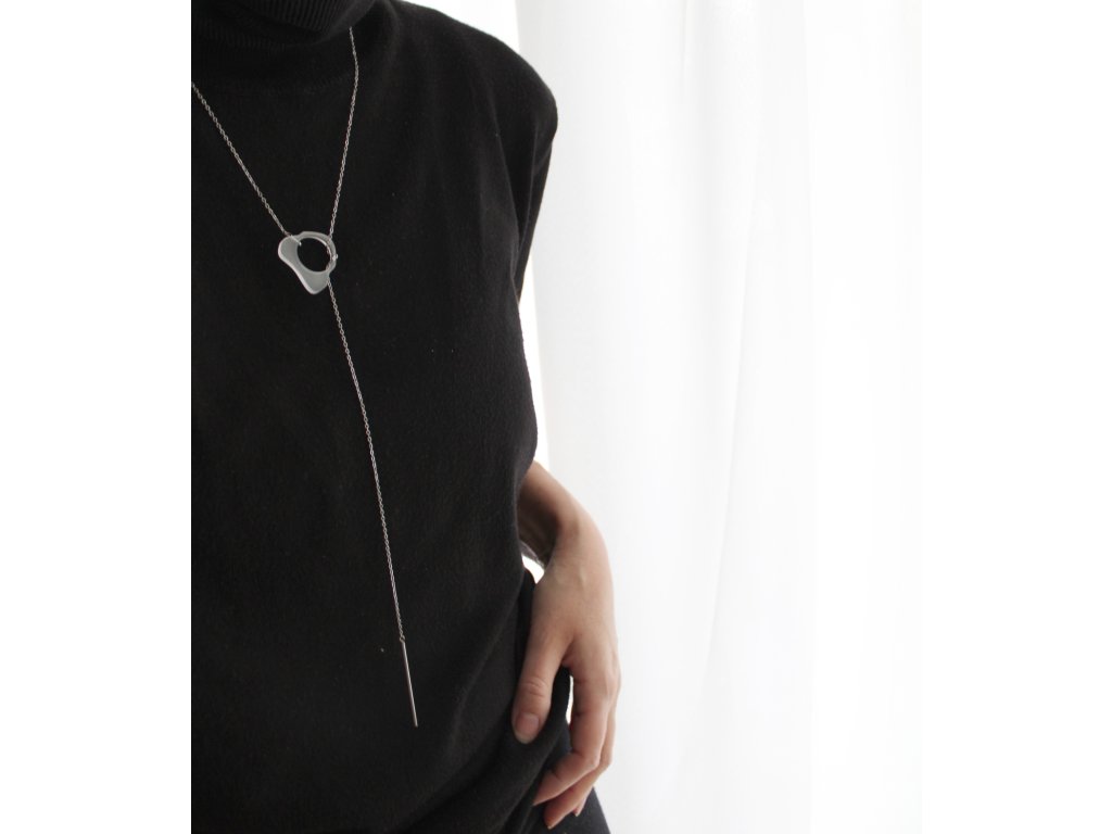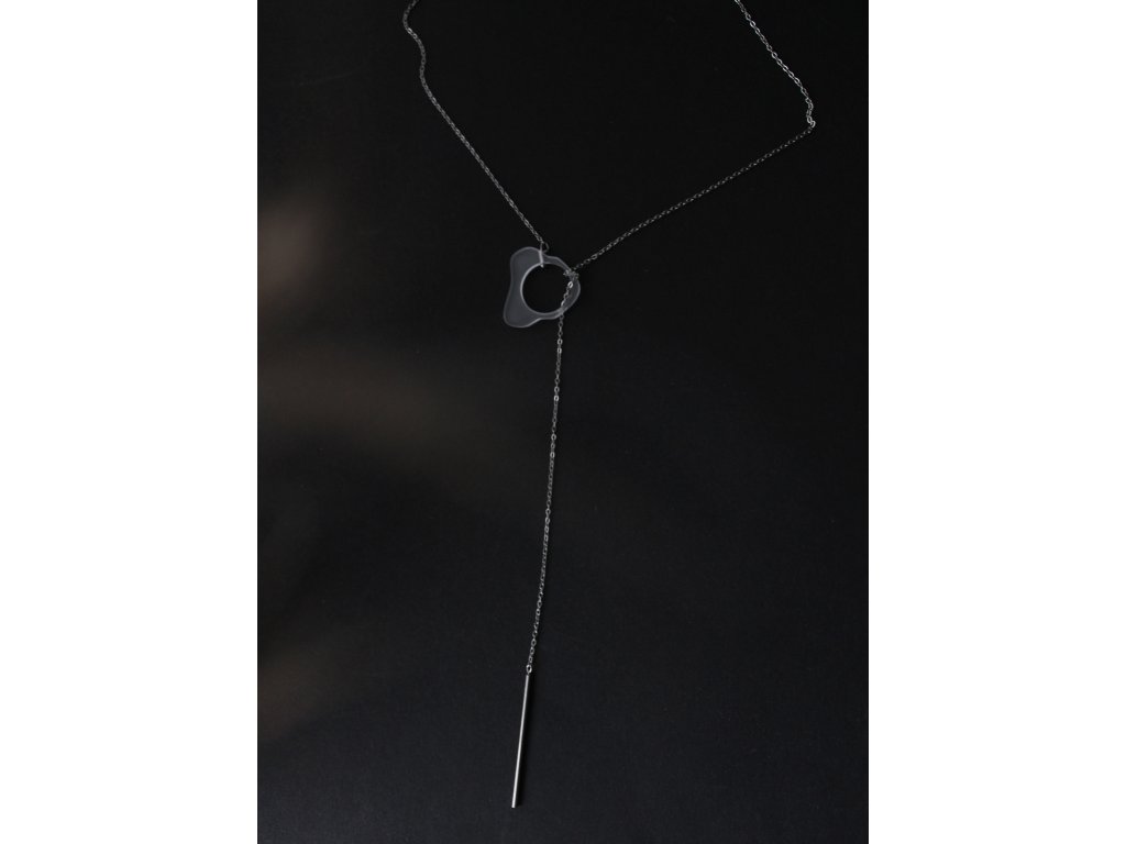 Elegantní náhrdelník, který funguje na principu protažení a obtočení nerezového řetízku skrze zvlněný kroužek z průsvitného akrylátového skla.