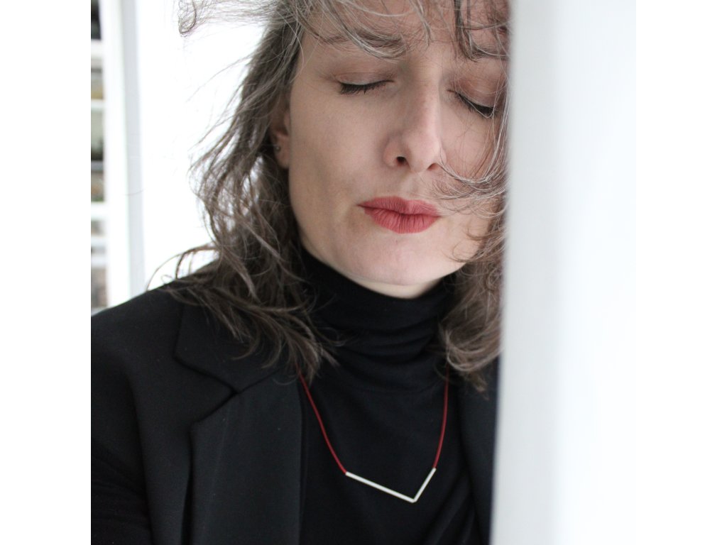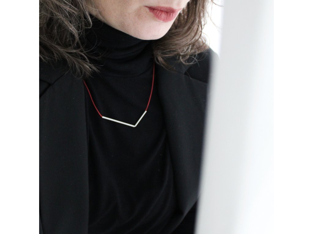 Limitovaná kolekce náhrdelníků s červenými lanky s jednoduchými tvary z nerezových trubiček.