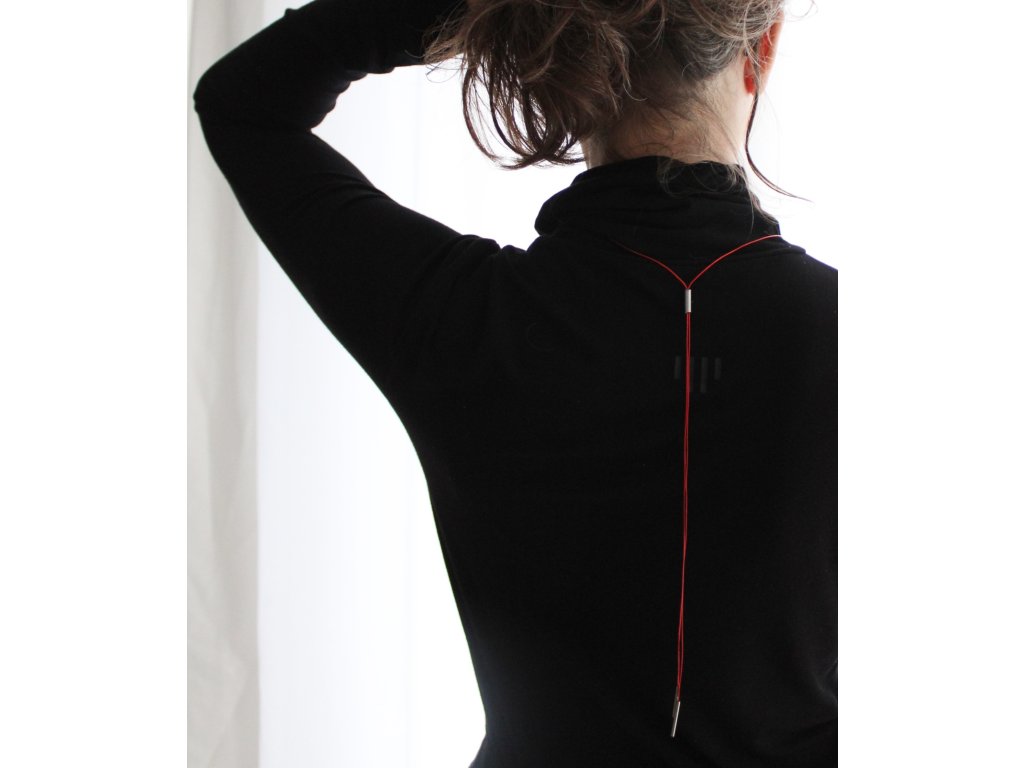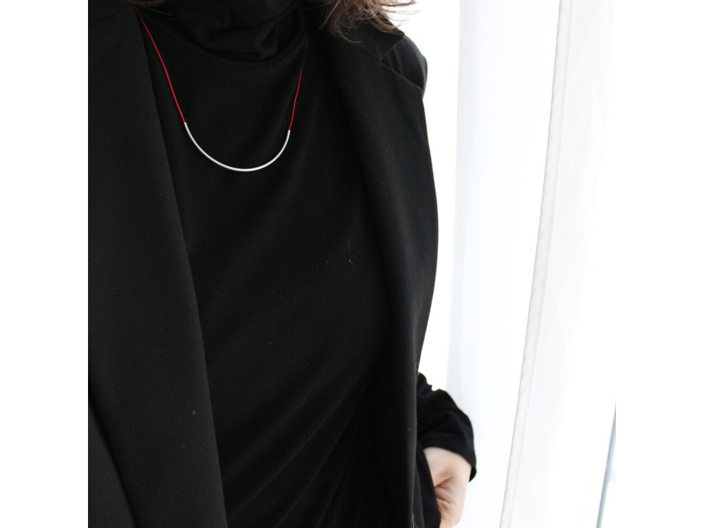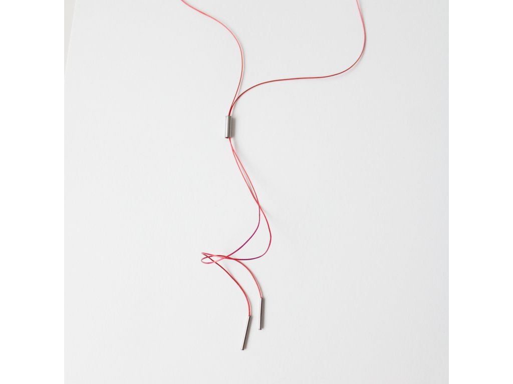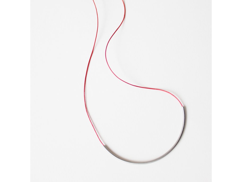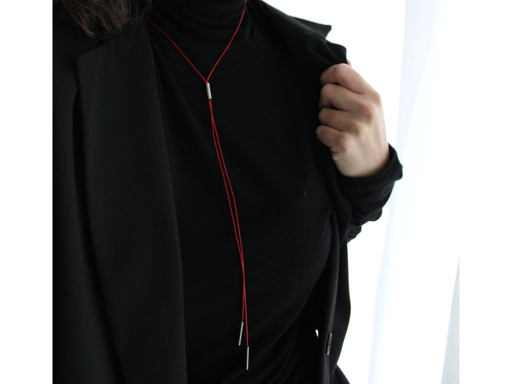 Limitovaná kolekce náhrdelníků s červenými lanky s jednoduchými tvary z nerezových trubiček.