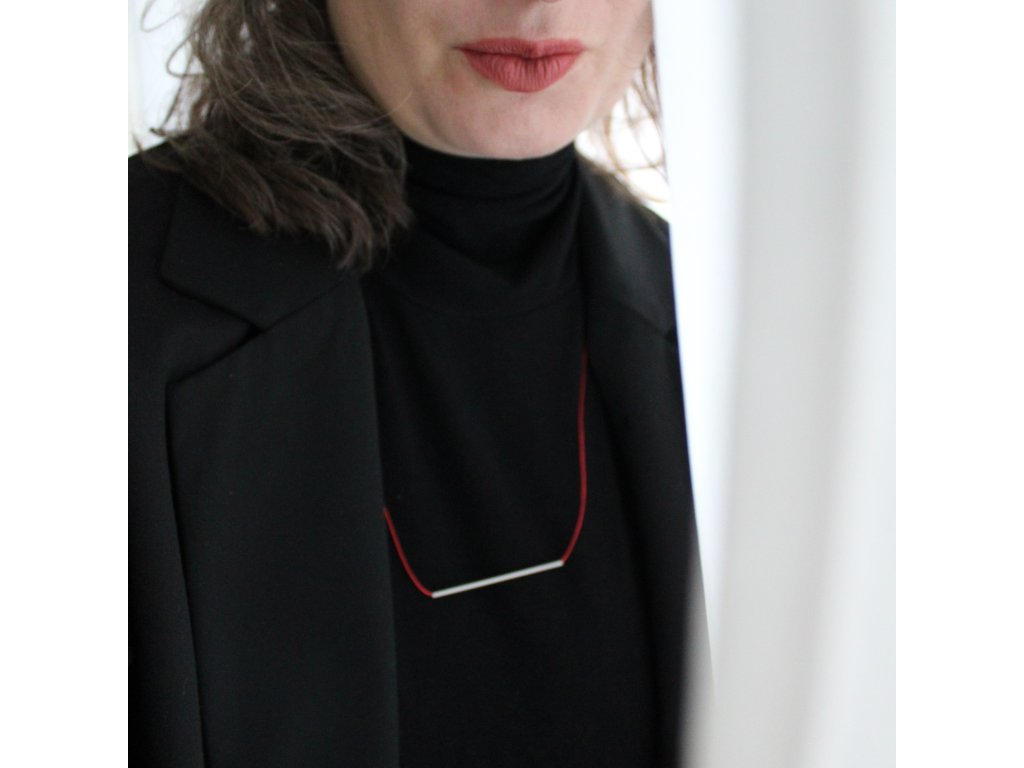 Limitovaná kolekce náhrdelníků s červenými lanky s jednoduchými tvary z nerezových trubiček.