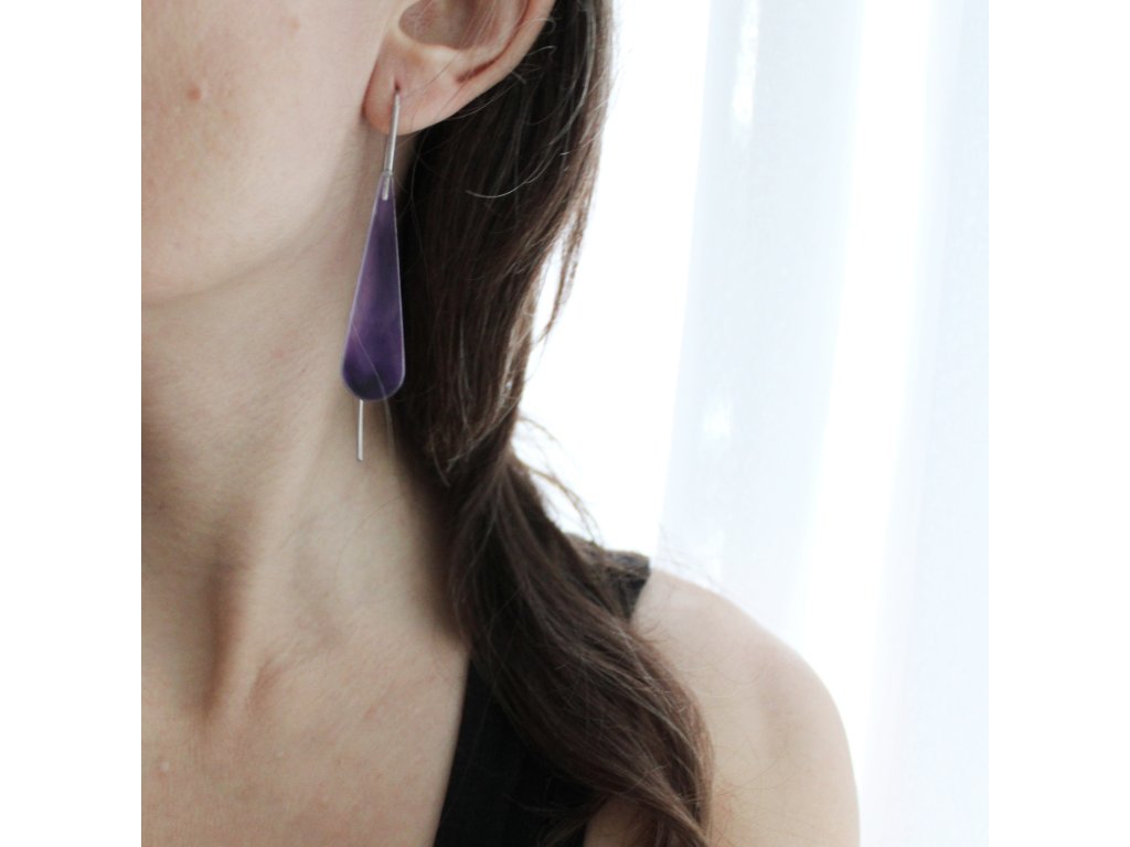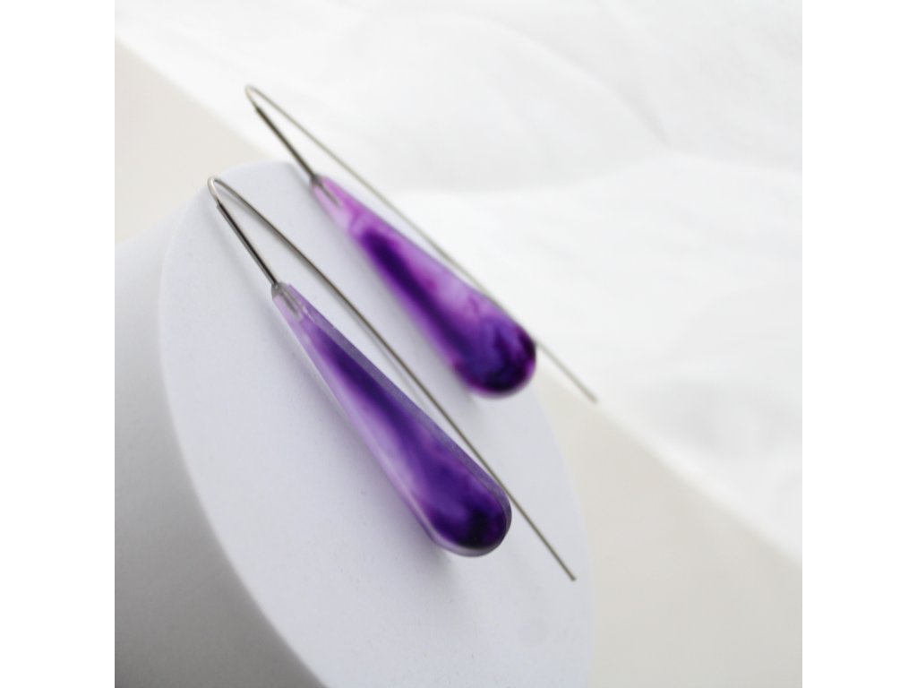 Elegantní, drobnější kapky z matně průsvitného akrylátového skla & fialová abstraktní malba a dlouhá ohýbaná linka z chirurgické oceli.