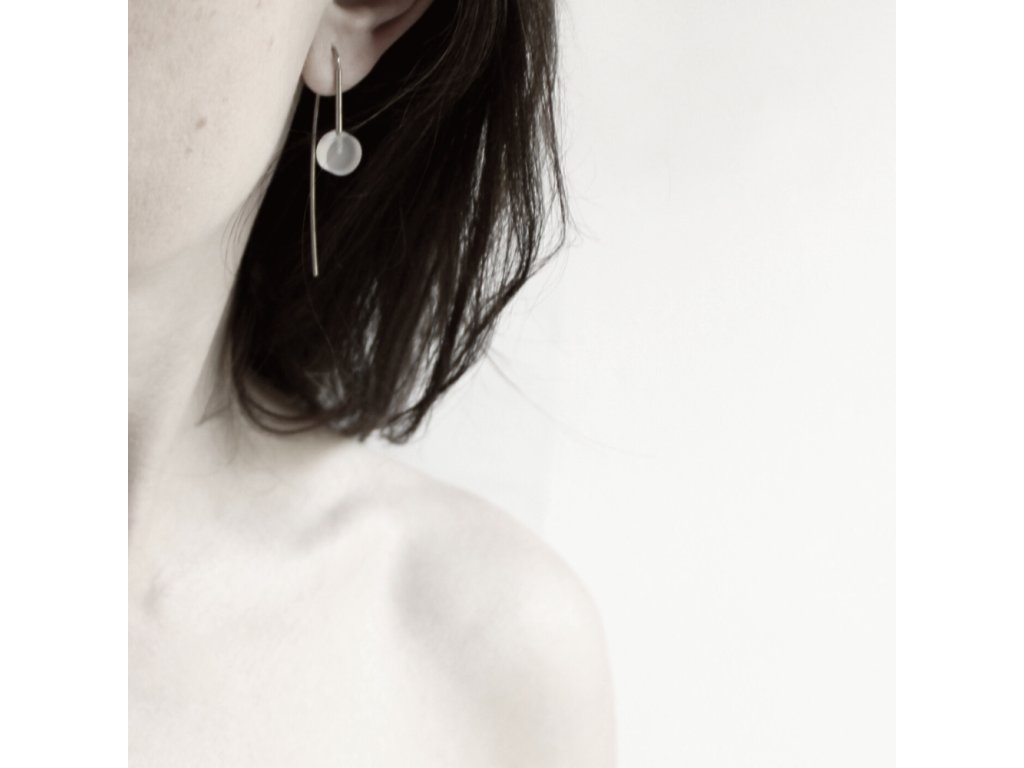 Elegantní, drobnější kolečka z matně průsvitného akrylátového skla a dlouhá ohýbaná linka z chirurgické oceli.